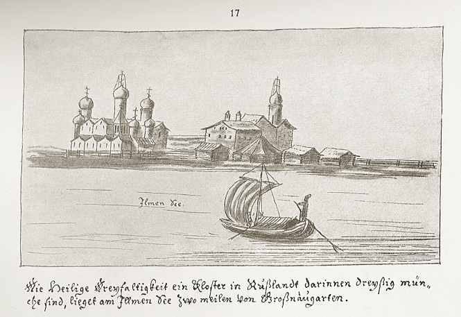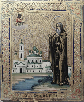 В 1419 году в Новгороде оказался младший сын Дмитрия Донского, лишенный удела и изгнанный своим братом Василием из Москвы князь Константин Дмитриевич. Как повествует житие Михаила, князь узнал голос инока, читавшего за трапезой в монастыре книгу Иова. Подойдя к иноку, Константин Дмитриевич опознал в нем представителя московской великокняжеской династии, ушедшего от мира, но сохранил его имя в тайне. Ученые не раз пытались разгадать, кто именно скрывался под именем Михаила. По одной из версий это был один из выживших сыновей великого князя Симеона Гордого, вся семья которого погибла от чумы. По другим — сын (или внук) героя Куликовской битвы Дмитрия Боброка-Волынского, вступившего в брак с дочерью Дмитрия Донского. Не так давно историк А. А. Турилов привел убедительные доказательства того, что святой Михаил мог быть рожденным вне брака или в непризнанном браке сыном можайского и белозерского князя Андрея Дмитриевича и внуком Дмитрия Донского.