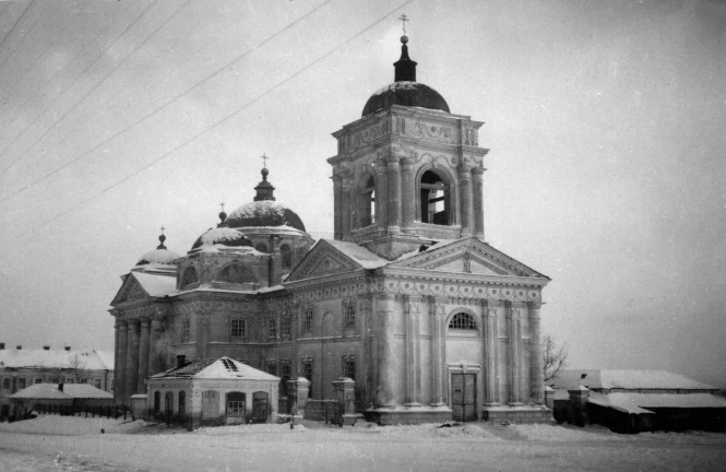 Деревянная церковь Преображения Господня упоминается в Писцовых книгах с 1626 года. К началу XIX века стало насущным возведение нового, каменного храма. Для строительства отвели место на Базарной площади, где стояло два церкви — Преображенская и Ильинская. «Первая — деревянная, приходит в ветхость и малоприходна; на место ея устроить каменную прихожане не в состоянии, — читаем в церковной переписке того времени. — Вторая хотя и каменная, но для прихожан невместительная и стоит не у места». Вместо них постановили выстроить один храм, «на приличном и по общему желанию граждан месте».